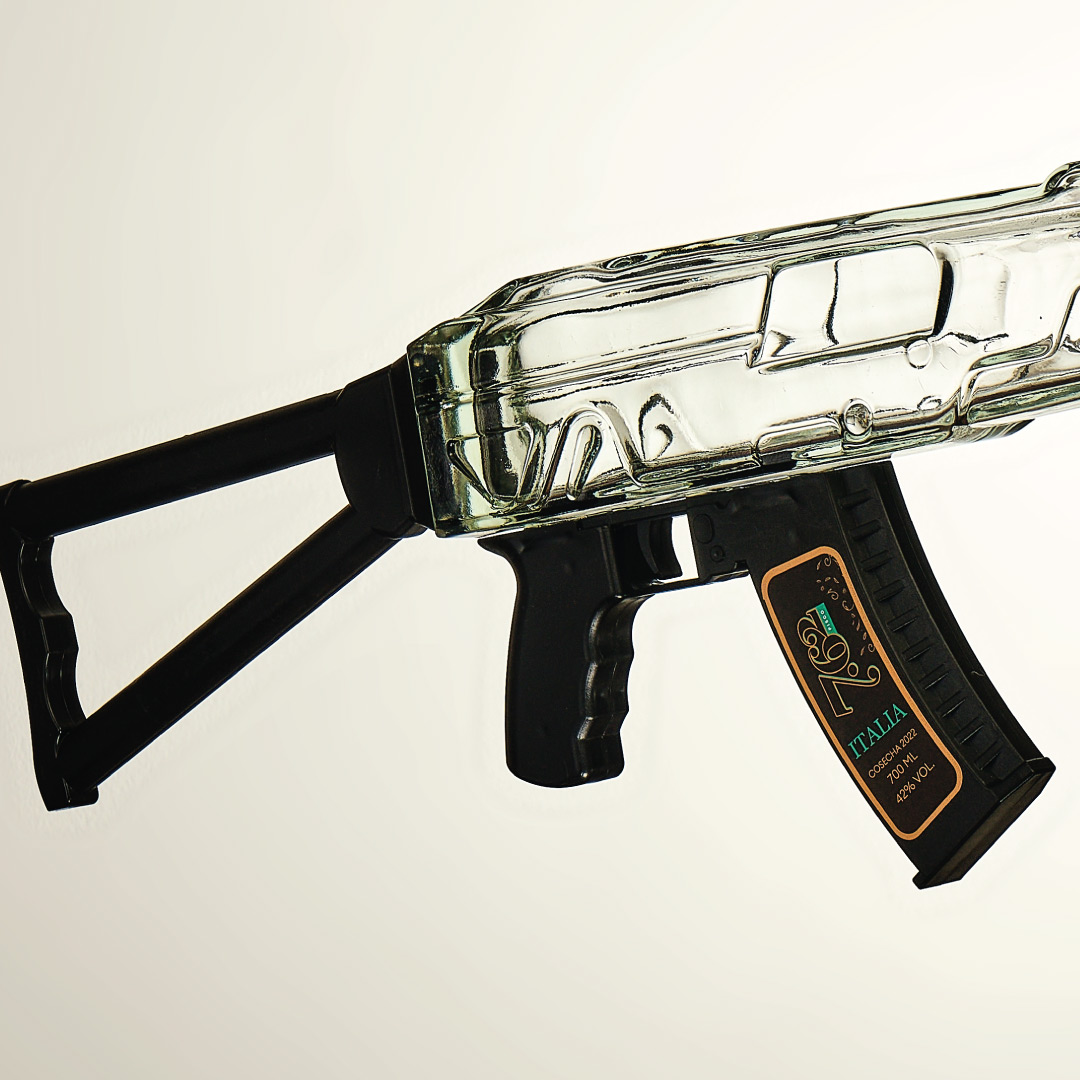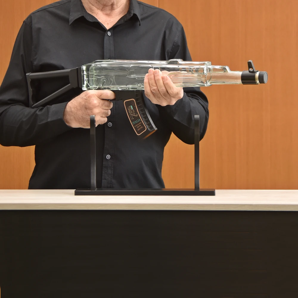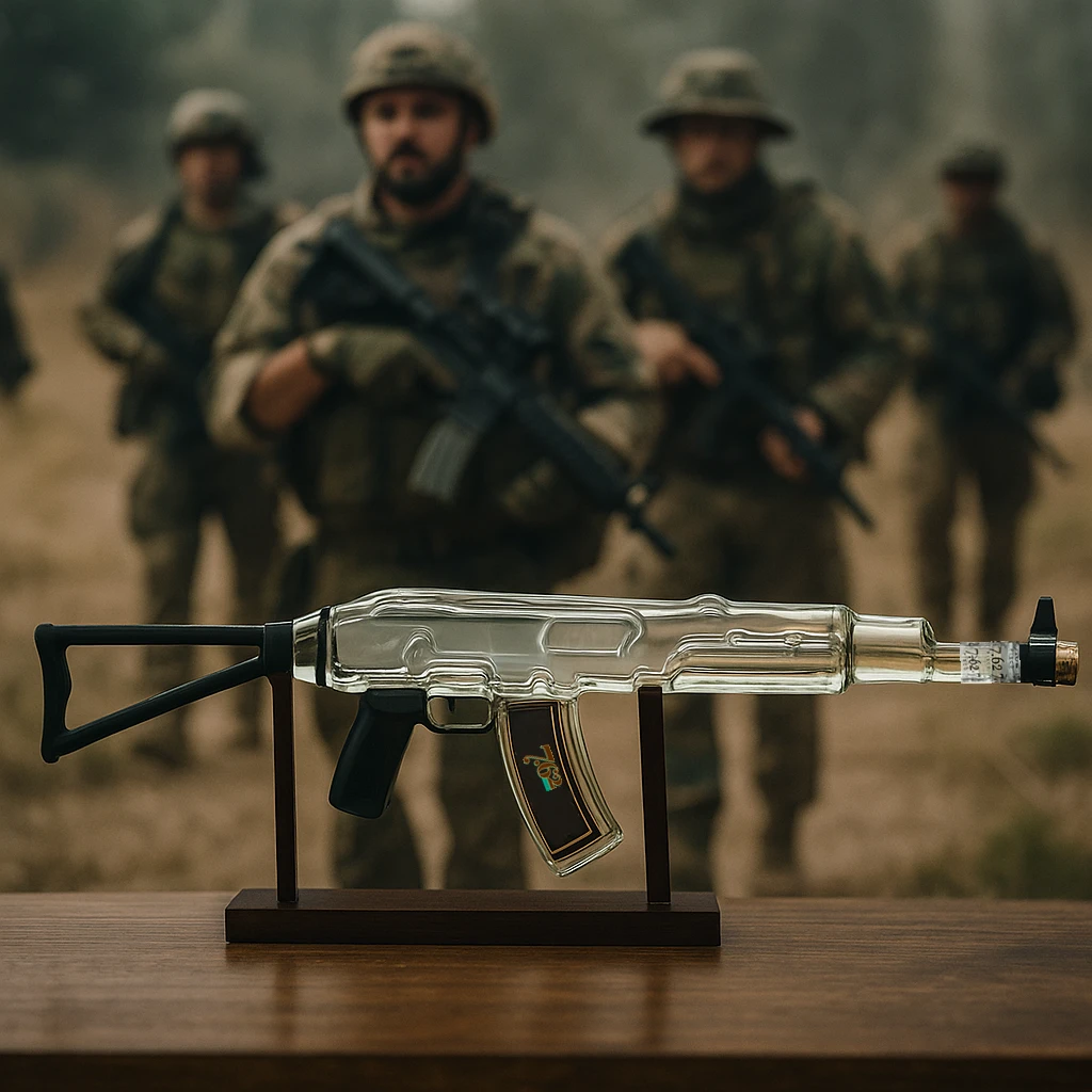 Presentamos una pieza de colección verdaderamente única, forjada a mano en vidrio de la más alta calidad. Esta botella reproduce con un detalle excepcional el diseño del icónico fusil AK-47, incluyendo su culata rebatible.