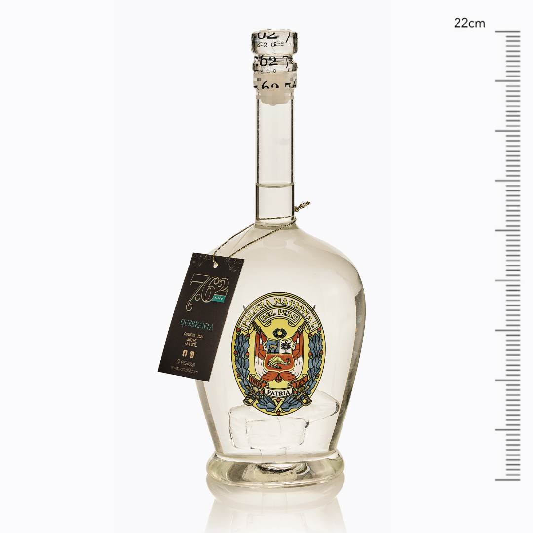 Elaborado bajo los mejores estándares de calidad en Santa Cruz de Flores, Mala, el pisco se complementa con una pieza de vidrio interna que reproduce el busto de un miembro de la Policía Nacional del Perú en saludo frontal, simbolizando honor y disciplina.